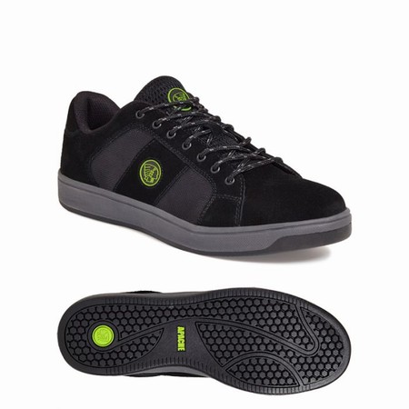 Black suede and canvas upper. Padded tongue and collar for added comfort. Steel toe cap protection and composite midsole protection. Lightweight EVA/rubber outsole. A retro styled cup sole safety trainer for light industrial applications.