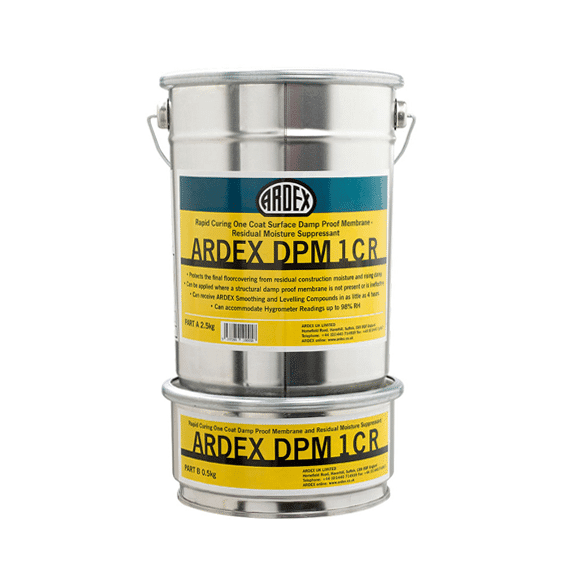 ARDEX DPM 1 C R is a rapid-drying, one-coat, two-component epoxy resin designed for fast-track installations, forming a durable damp-proof membrane with high bond strength, able to accommodate moisture readings up to 98% RH. It resists water, grease, oil, aqueous salt solutions, and dilute mineral and organic acids. Ideal for creating a damp-proof barrier, is used to suppress residual moisture in sound, well-compacted concrete slabs and cement/sand screeds with moisture readings up to 98% RH. It can also be applied in thinner layers for moisture suppression in concrete up to 92% RH and on Calcium Sulphate screeds up to 90% RH under specific conditions.