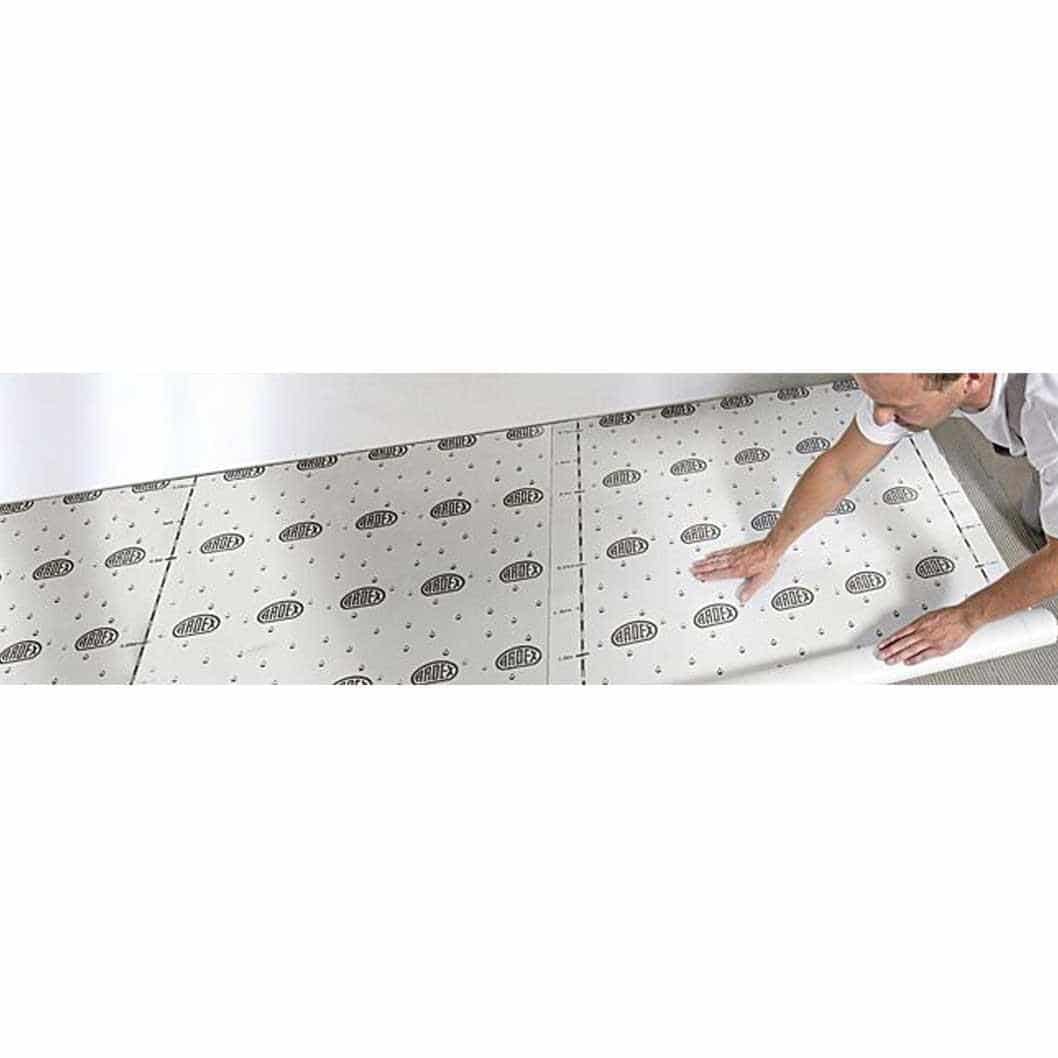 ARDEX RAPIDLAY MEMBRANE is a specially coated, fiberglass-reinforced sheet underlay designed for efficient installation of floor coverings, particularly sheet vinyl, over a range of new or old sub-floors in residential and light commercial settings. It is suitable for diverse surfaces, including contaminated or damp sub-floors, old vinyl, ceramic tiles, sheet metal, and asphalt, offering a dimensionally stable and moisture-resistant base. This sheet underlay reduces installation time by bypassing typical drying periods, allows for easy removal of temporary flooring without adhesive damage, and is low in VOCs, making it environmentally friendly.