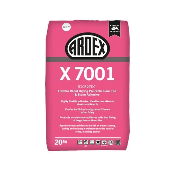 ARDEX X 7001 /ARDEX X 7001W is a grey or white, MICROTEC fibre-reinforced, rapid hardening and drying flexible cement-based floor tile adhesive. It is designed for use on wood-based sheets, boards, and other surfaces, making it ideal for internal applications such as fixing floor tiles and tile backer boards. The built-in fibres help minimize the risk of cracking over board joints in the event of timber movement, while its pourable consistency enables solid bedding of tiles without back-buttering. Classified under BS EN 12004 C2 FE as an “improved cementitious adhesive with extended open time,” ARDEX X 7001/ARDEX X 7001W allows for grouting to commence just two hours after application and is particularly suited for moisture-sensitive natural and agglomerated stones.