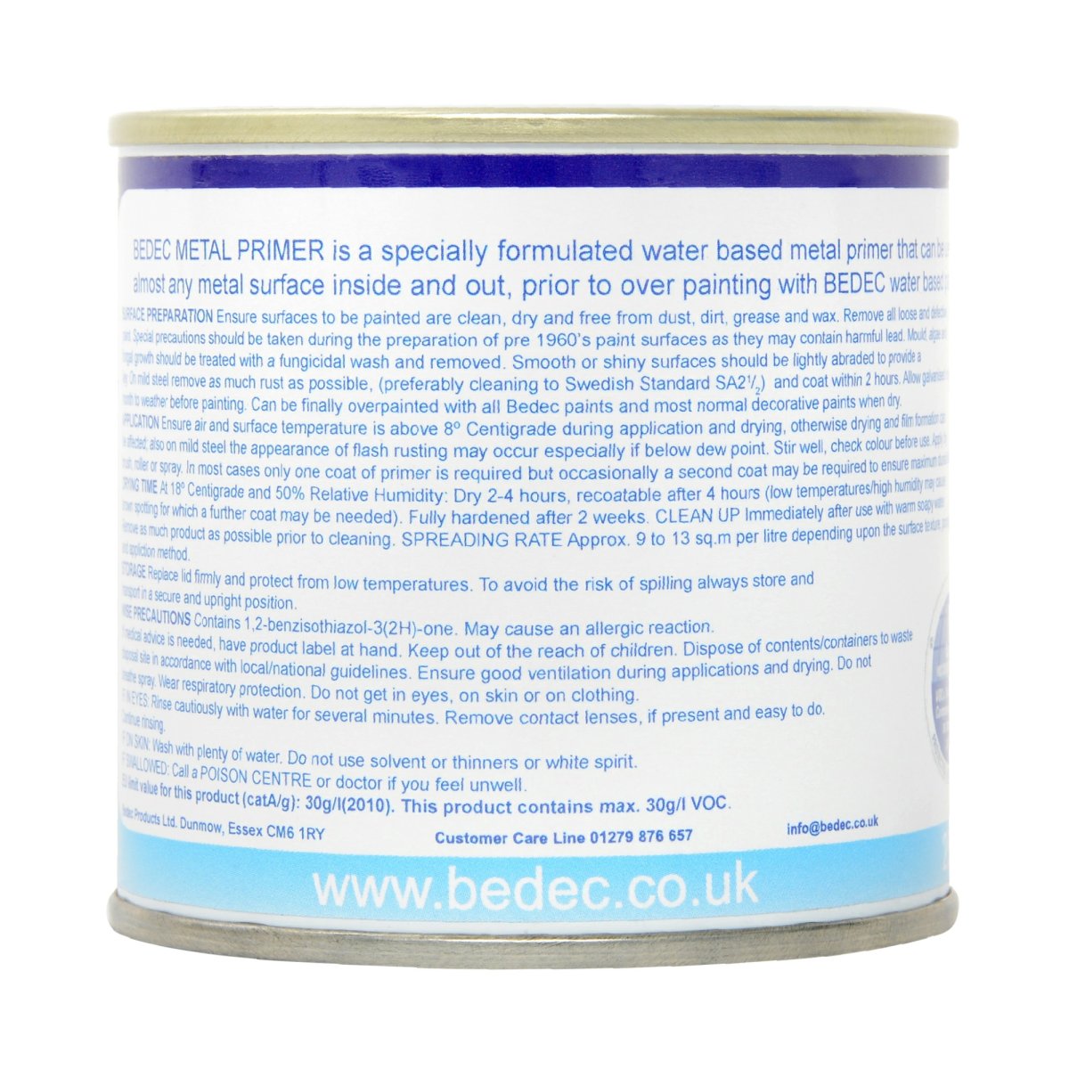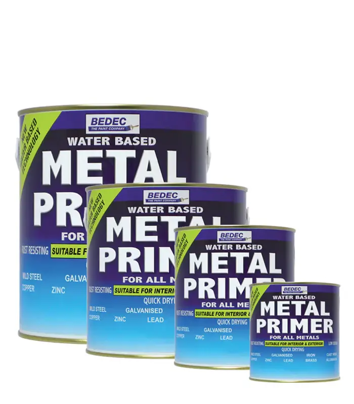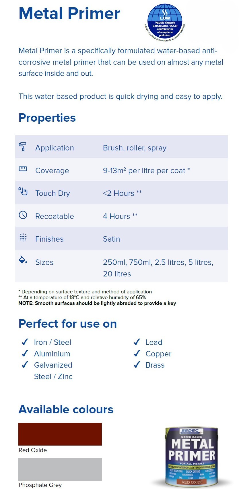 Bedec Metal Primer is a water-based metal primer that can be used on ferrous and non-ferrous metals on both interior and exterior substrates. Ideal for all types of metal implements, tools, and structures in and around gardens, farms, houses, and factories prior to overpainting with Bedec or similar water-based paints. The quick drying formulation is resistant to rust and reduces flash rusting.