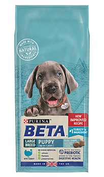 PURINA Beta Large Breed Puppy is a complete pet food loaded with Turkey ideally suited to large breed puppies. It is also suitable for gestation and lactation of large breed bitches.