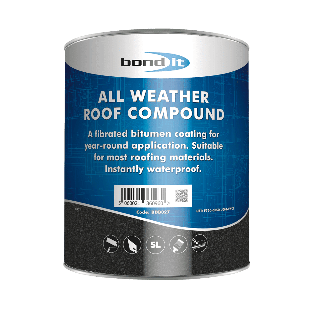 Bond It All Weather Roof Compound is a general purpose, high performance, waterproof coating suitable for use on mastic asphalt, roofing felt, corrugated iron, fibre/cement, slates, lead, copper, tin and zinc. Excellent resistance to extremes of temperature and does not crack in the cold or flow in the sun. Recommended where the threat of frost or rain precludes the use of an emulsion. Can be over coated with a suitable decorative solar reflective paint to prolong the life of the coating.