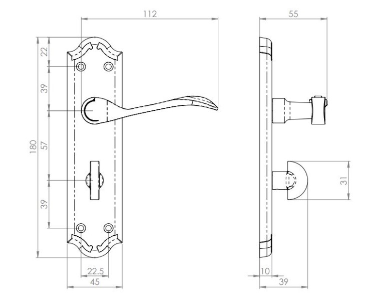 Madrid Lever on bathroom backplate. 180x45mm backplate. 57mm CC lever to 5mm spindle. Classically styled curved lever on a shaped backplate with detailing to both lever and backplate. Suitable for a more traditional doors. Comes with a 10 year mechanical guarantee and is Fire door rated.