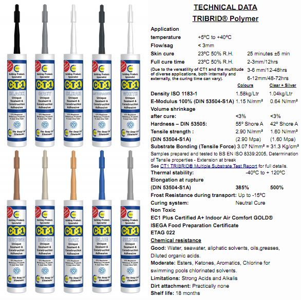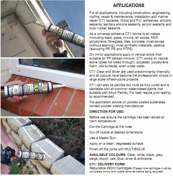 The ultimate development in bonding and sealing. Indoor and Outdoor. CT1 offers a unique adhesion on virtually any material without the need for additional fixing. Does the job first time, every time. Can be used on dry, damp or wet surfaces, even underwater. Used in production industries such as Marine, Aviation and Motor. Will successfully bond: Metals (including lead), Glass, Mirrors, Wood, Polystyrene, Concrete, All stones (without staining), Most synthetic materials, Fibreglass, Plastics (excluding polypropylene), Excellent resistance to chemicals