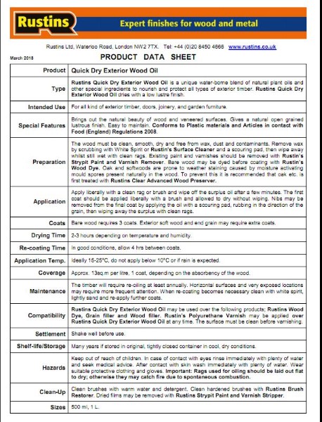 A unique water-borne blend of natural plant oils and other special ingredients to norish and protect all types of outdoor timber which dries with a low lustre finish. It is a penetrating oil drying to a hard durable and water resistant seal that brings out the beauty of the grain within the timber. Rustins Exterior Wood Oil confirms to The Articles in Contract with Food Regulations. Can be used for both interior & exterior application. Clean brushes with water.