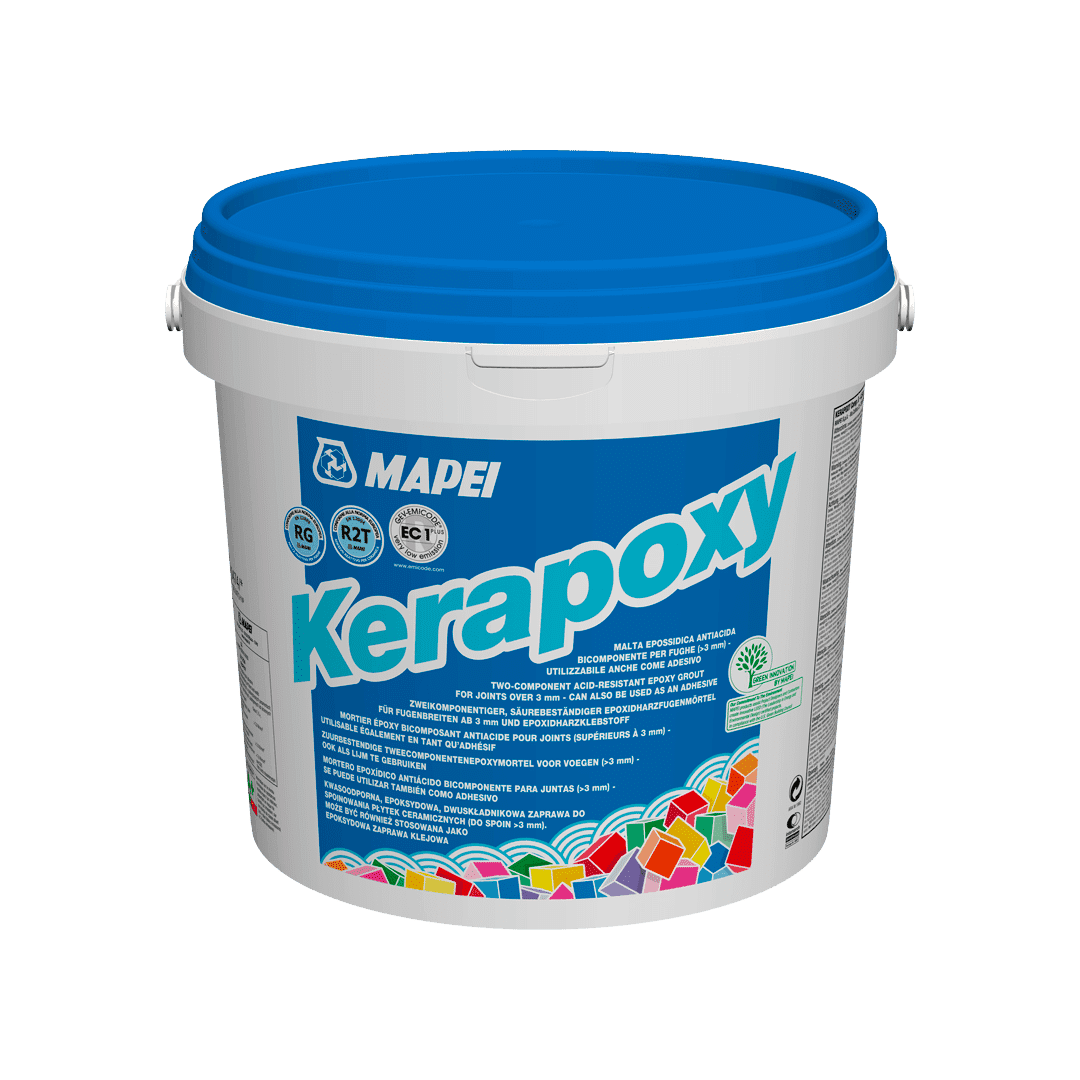 Kerapoxy is a two-component, epoxy-resin based product with silica sand and special components, with excellent resistance to acids and excellent cleanability. This is a product with very low emission of volatile organic compounds and is classified Emicode EC1 R Plus by GEV when used for grouting.