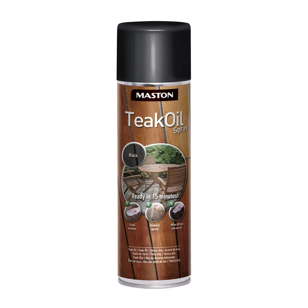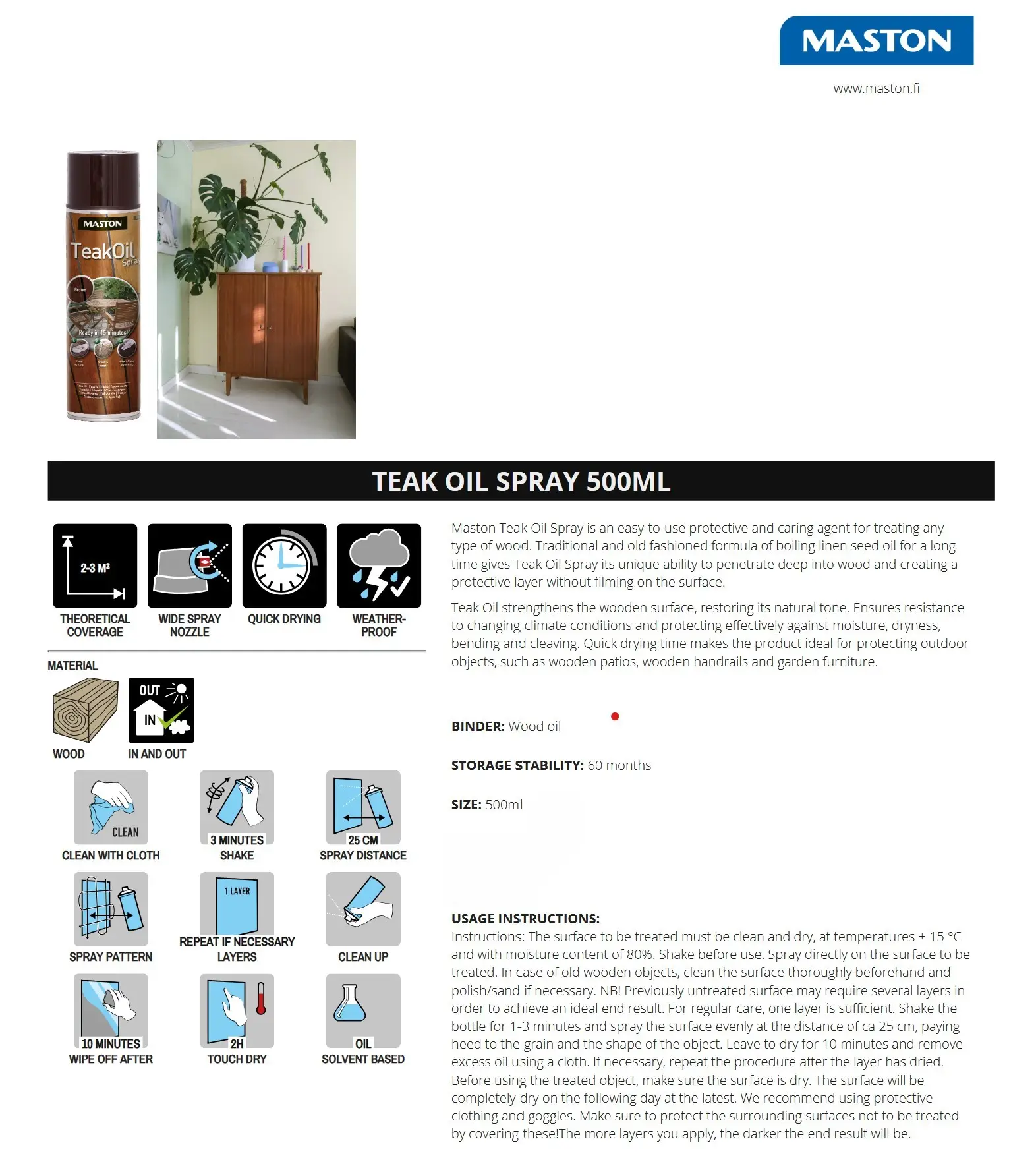Maston Teak Oil Spray is an easy-to-use protective and caring agent for treating any type of wood. Traditional and old fashioned formula of boiling linen seed oil for a long time gives Teak Oil Spray its unique ability to penetrate deep into wood and creating a protective layer without filming on the surface.