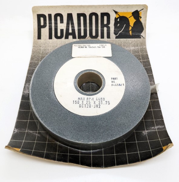 Aluminium oxide grinding wheel. 6in x 1in x 1.1/4in. 150x25x31.75mm. 120 Grit. Maximum speed 4460 RPM.
