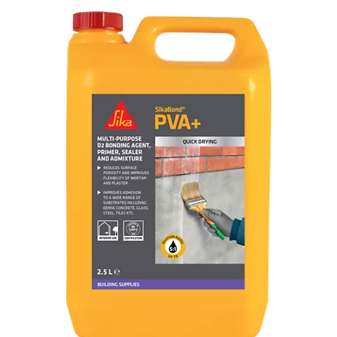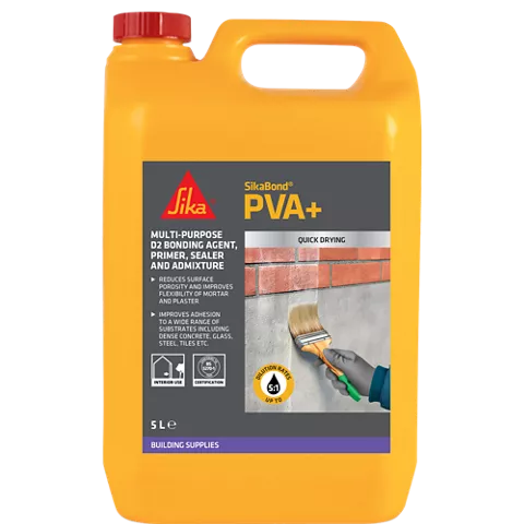 SikaBond® PVA+ is a medium-viscosity, polyvinyl alcohol stabilized, externally plasticised vinyl acetate homopolymer designed for use in the building industry. It serves as a quick-drying general-purpose bonding agent, primer, and sealer for concrete and plaster, while also acting as a mortar improver and admixture for screeds and renders. The product is suitable as an adhesive for porous substrates such as wood, cork, paper, textiles, and cardboard, as well as a bonding agent for plaster, cement screeds, and renders on sound surfaces like concrete, stone, and brick. Additionally, it can be used as an internal filler when mixed with wood shavings or plaster. SikaBond® PVA+ improves adhesion, reduces surface porosity and dusting, enhances flexibility and frost resistance, allows thinner applications, and is quick-drying, with total solids of 32–37% and a Minimum Film Forming Temperature of -2 °C to +5 °C. It meets the bond strength requirements of BS 5270: Part 1:1989 and is classified as a D2 wood adhesive under EN 204:2016.