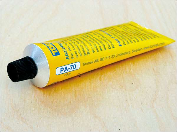 Tormek honing paste PA-70 is used on the leather honing wheels. 3 micron grain size.